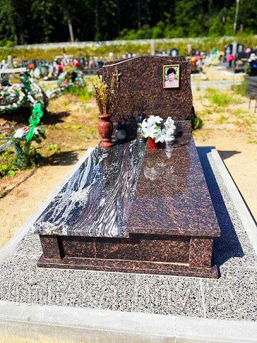 ПАМЯТНИК ВЫПОЛНЕН ИЗ РОССИЙСКОГО ГРАНИТА КОРИЧНЕВОГО ЦВЕТА БАЛТИЙСКИЙ В СОЧЕТАНИИ С ОДНОЙ ВЕРХНЕЙ ПЛИТОЙ ИЗ ГРАНИТА АМФИБОЛИТ, КОТОРЫЙ ИМЕЕТ ОЧЕНЬ ИНТЕРЕСНЫЙ, НЕОРДИНАРНЫЙ РИСУНОК, ЧТО ПРИДАЁТ ВСЕМУ КОМПЛЕКСУ НЕПОВТОРИМОСТЬ. НА СТЕЛЕ МОНТИРОВАНЫ НАКЛАДНЫЕ БУКВЫ, ЦИФРЫ, КРЕСТ ИЗ БРОНЗЫ И ЦВЕТНОЙ МЕДАЛЬОН В БРОНЗОВОЙ РАМКЕ. УГОЛКИ И ОТМОСТКА ИЗ ГРАНИТА ЗАВЕРШАЮТ ВИД ВСЕМУ ПАМЯТНИКУ, А ПЛИТКА ПО ВСЕМУ ПЕРИМЕТРУ ПЛОЩАДКИ И БОРДЮР - ВСЕМУ КОМПЛЕКСУ.