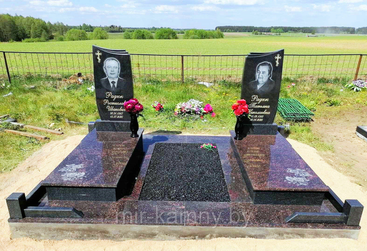ГРАНИТНЫЙ КОМПЛЕКС НА ТРОЙНОЕ ЗАХОРОНЕНИЕ СКОМБИНИРОВАН ИЗ ДВУХ ВИДОВ ГРАНИТА: КАРЕЛЬСКИЙ ЧЁРНЫЙ ГАББРО-ДИАБАЗ И КОРИЧНЕВЫЙ БАЛТИЙСКИЙ, ЧТО В СОЧЕТАНИИ ВЫДЕЛЯЕТСЯ КАЖДЫЙ ЭЛЕМЕНТ ПАМЯТНИКА. ДВА ПАМЯТНИКА ОТЗЕРКАЛЕНЫ ДРУГ К ДРУГУ, МЕЖДУ НИМИ ОСТАВЛЕНО МОНТАЖНОЕ ОКНО НУЖНОГО РАЗМЕРА ДЛЯ ПОСЛЕДУЮЩЕГО ПОДХОРОНЕНИЯ И ТАКЖЕ ОТЗЕРКАЛИВАНИЯ ТАКОГО ЖЕ ПАМЯТНИКА. ВСЯ ПЛОЩАДКА ОБЛИЦОВАНА ЦЕЛЬНЫМИ ГРАНИТНЫМИ ПЛИТАМИ, А ПО ЕЁ УГЛАМ УСТАНОВЛЕНЫ УГОЛКИ В ВИДЕ ОГРАДКИ. ФИГУРНЫЕ СТЕЛЫ ИМЕЮТ КРАСИВЫЕ ВЫРЕЗЫ И ВЕЕРА, А ХУДОЖЕСТВЕННОЕ ОФОРМЛЕНИЕ НА НИХ ВЫПОЛНЕНО СЛЕДУЮЩИМ ОБРАЗОМ: ПОРТРЕТЫ НАНЕСЕНЫ МЕТОДОМ ГРАВИРОВКИ, ТЕКСТ - МЕТОДОМ ГЛУБОКОЙ РУБКИ С НАНЕСЕНИЕМ ЗОЛОТОЙ КРАСКИ. НАДГРОБИЯ В КЛАССИЧЕСКОМ СТИЛЕ ИМЕЮТ ЦЕЛЬНЫЕ ВЕРХНИЕ НАДГРОБНЫЕ ПЛИТЫ.