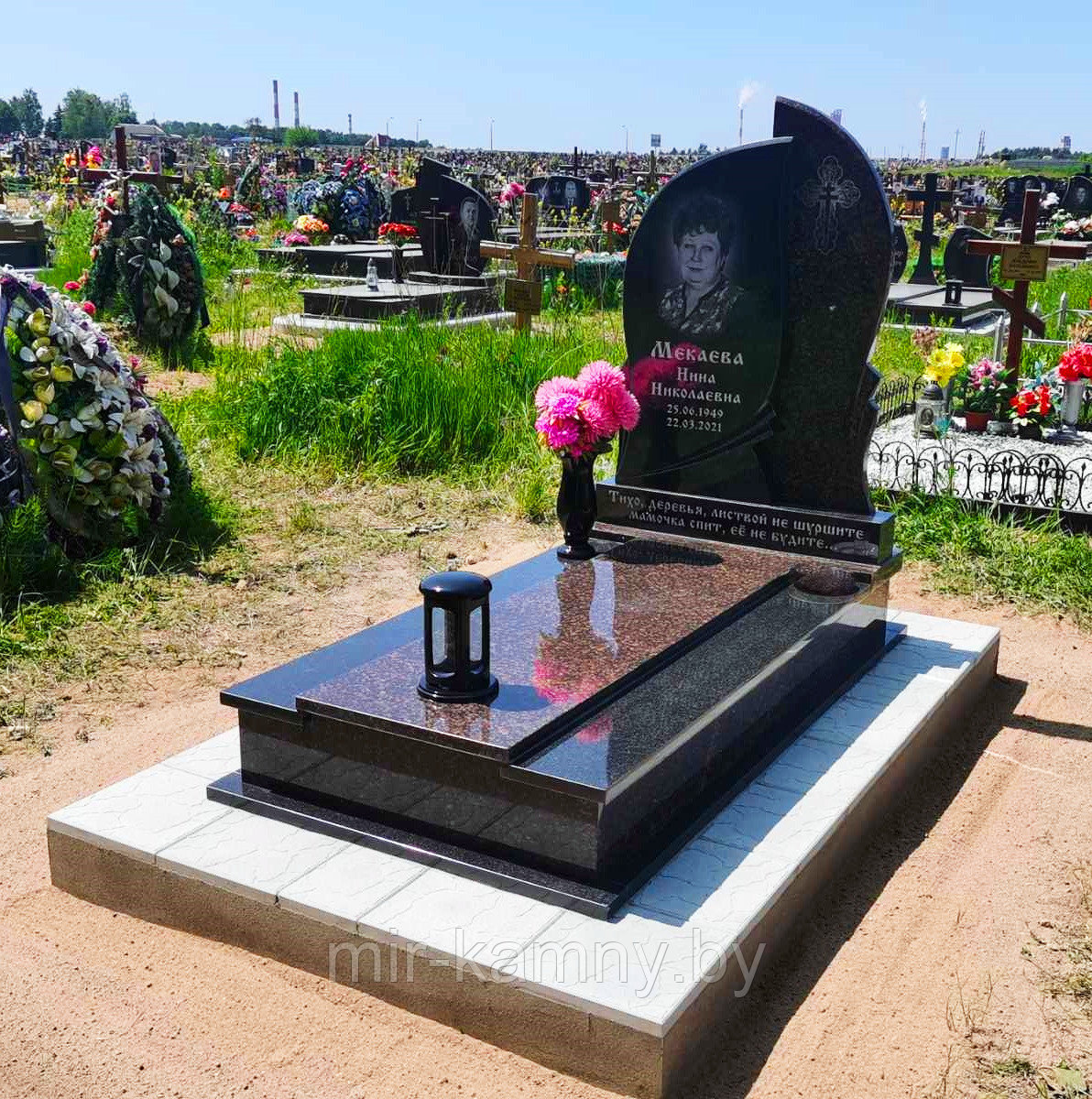 КОМПЛЕКС НА ОДИНОЧНОЕ ЗАХОРОНЕНИЕ СКОМБИНИРОВАН ИЗ ДВУХ ВИДОВ ГРАНИТА: КАРЕЛЬСКИЙ ЧЁРНЫЙ ГАББРО-ДИАБАЗ И КОРИЧНЕВЫЙ БАЛТИЙСКИЙ, В СОЧЕТАНИИ КОТОРЫХ ВЫДЕЛЯЕТСЯ КАЖДЫЙ ЭЛЕМЕНТ ПАМЯТНИКА. ДВЕ ФИГУРНЫЕ СТЕЛЫ С КРАСИВЫМИ ВЕЕРАМИ РУЧНОЙ РАБОТЫ СОСТАВЛЕНЫ МЕЖДУ СОБОЙ И УСТАНОВЛЕНЫ НА МАССИВНУЮ ПОДСТАВКУ. ХУДОЖЕСТВЕННОЕ ОФОРМЛЕНИЕ СТЕЛ ВЫПОЛНЕНО МЕТОДОМ ЛАЗЕРНОЙ ГРАВИРОВКИ. НАДГРОБНЫЕ ПЛИТЫ ТАКЖЕ СОСТАВЛЕНЫ ПО ЦВЕТОВОЙ ГАММЕ, ЧТО ПРИДАЁТ НАДГРОБИЮ МНОГОГРАННОСТЬ. ГРАНИТНАЯ ОТМОСТКА ПОД НАДГРОБИЕМ ВИЗУАЛЬНО ПРИДАЁТ ОТРАЖЕНИЕ ВЕРХНИМ ПЛИТАМ И ПОДЫМАЕТ НАДГРОБИЕ ЕЩЁ НА 3 СМ ВЫШЕ. ВЫСОКАЯ БЕТОННАЯ ПЛОЩАДКА ОБЛИЦОВАНА ТРОТУАРНОЙ ПЛИТКОЙ.