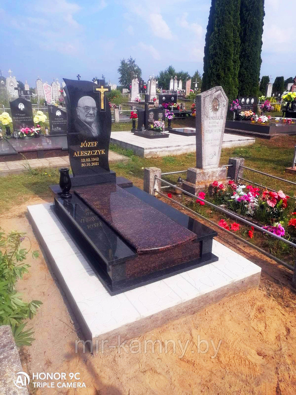 ОДИНАРНЫЙ ПАМЯТНИК СКОМБИНИРОВАН ИЗ КАРЕЛЬСКОГО ЧЁРНОГО ГРАНИТА ГАББРО-ДИАБАЗ И КОРИЧНЕВОГО БАЛТИЙСКИЙ. НА ФИГУРНОЙ СТЕЛЕ СБОКУ ВЫРЕЗАН РОВНЫЙ КОНТУР КРЕСТА, ВНУТРИ КОТОРОГО СДЕЛАН ФИГУРНЫЙ КРЕСТ МЕТОДОМ ГЛУБОКОЙ РУБКИ С ЗОЛОТОЙ ПОКРАСКОЙ ТАКЖЕ КАК И ТЕКСТ, А ПОРТРЕТ НАНЕСЁН МЕТОДОМ ЛАЗЕРНОЙ ГРАВИРОВКИ. ТАКОЕ ХУДОЖЕСТВЕННОЕ ОФОРМЛЕНИЕ СМОТРИТСЯ КРАСИВО И ВЕЛИЧЕСТВЕННО! НАДГРОБИЕ ИЗ СОСТАВНЫХ ПЛИТ УСТАНОВЛЕНО НА ВЫСОКУЮ БЕТОННУЮ ПЛОЩАДКУ, ОБЛИЦОВАННУЮ ТРОТУАРНОЙ ПЛИТКОЙ. ГРАНИТНАЯ ОТМОСТКА И УГОЛКИ В ТОРЦАХ НАДГРОБИЯ ЗАВЕРШАЮТ ПОЛНОЦЕННЫЙ ВИД ВСЕМУ КОМПЛЕКСУ.