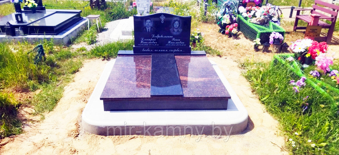 ДВОЙНОЙ КОМПЛЕКС СКОМБИНИРОВАН ИЗ КОРИЧНЕВОГО ГРАНИТА БАЛТИЙСКИЙ И ЧЁРНОГО ГАББРО-ДИАБАЗ. НА ГОРИЗОНТАЛЬНОЙ СТЕЛЕ, С КРАСИВОЙ ВОЛНОЙ СВЕРХУ, ПОРТРЕТЫ И ТЕКСТ НАНЕСЕНЫ МЕТОДОМ ЛАЗЕРНОЙ ГРАВИРОВКИ. СТЕЛА С МАССИВНОЙ ПОДСТАВКОЙ УСТАНОВЛЕНЫ НА НАДГРОБИЕ ИЗ КОМБИНИРОВАННЫХ ПЛИТ, РАЗМЕР КОТОРОГО ВЗЯТ 160Х180Х23, ЭТО МЕНЬШЕ СТАНДАРТНОГО, Т.К. ПОДХОРОНЕНИЯ БОЛЬШЕ НЕ ПЛАНИРУЕТСЯ.