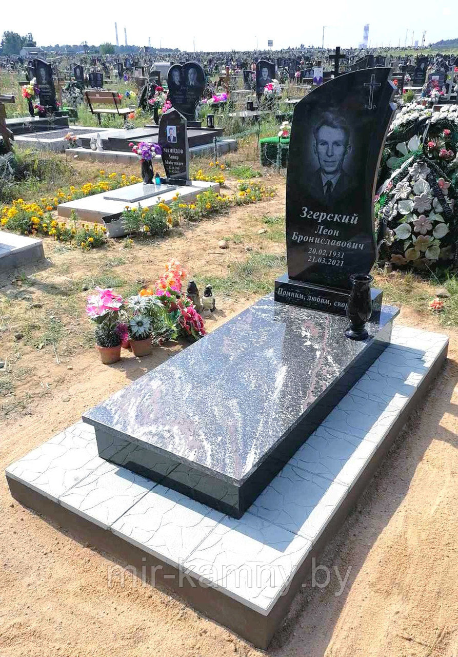Гранитный памятник с надгробием для благоустройства одиночного захоронения выполнен из черного Карельского габбро-диабаза и пестрого Амфиболита гранатового. На небольшое надгробие 160х70х20, состоящее из 5-и плит, установлена на подставке вертикальная фигурная стела. Художественное оформление выполнено методом гравировки. Сдержанный и минималистичный в композиционном плане, памятник не утратит своей привлекательности и актуальности спустя много лет.